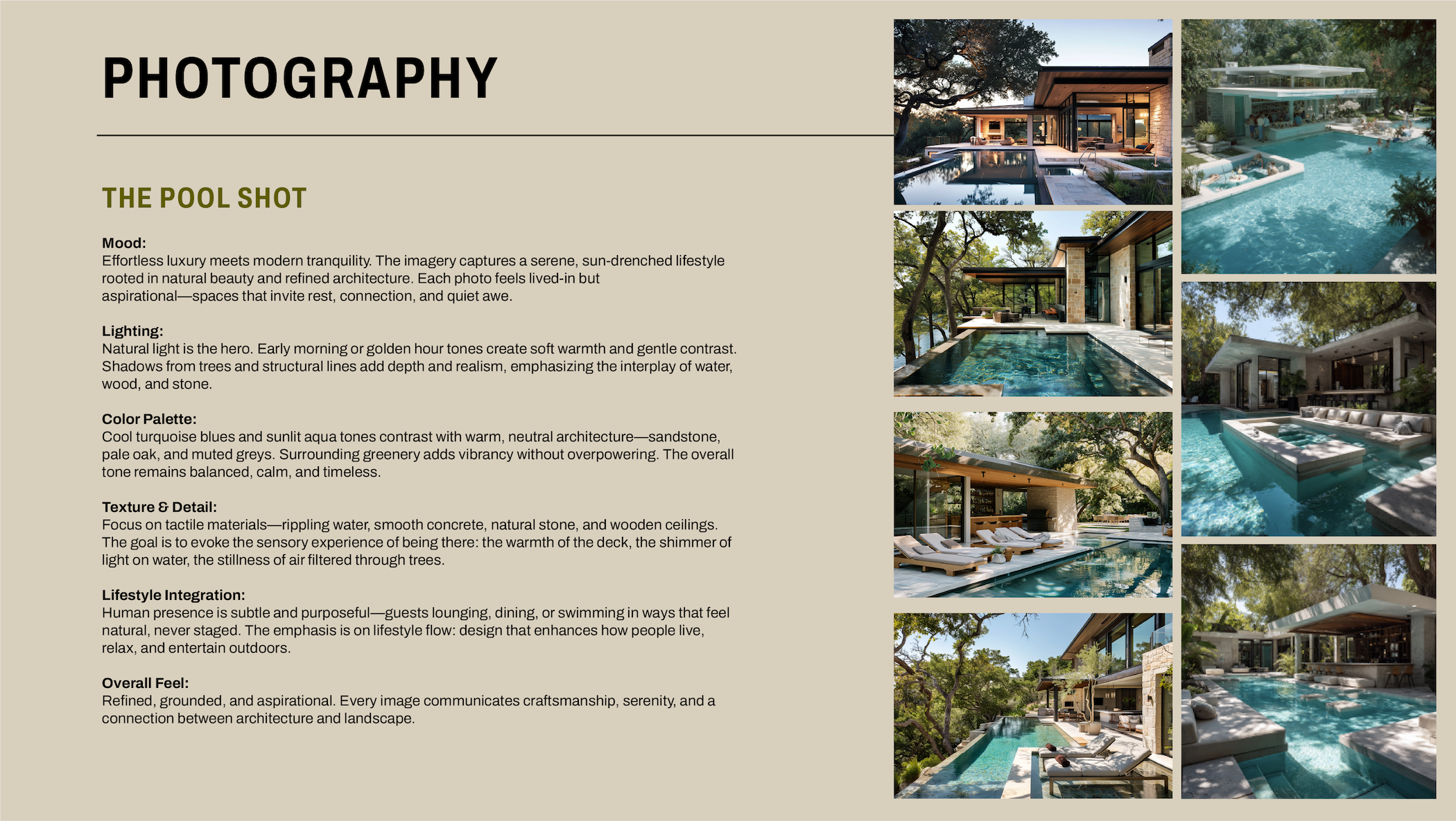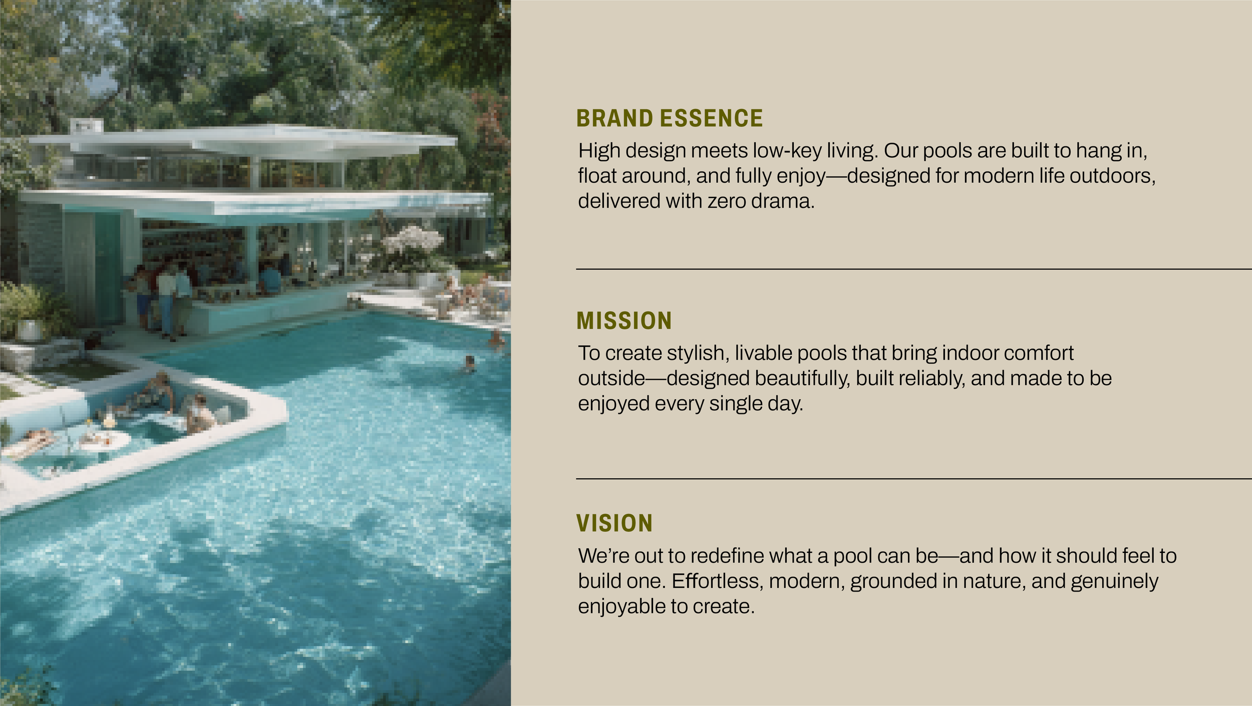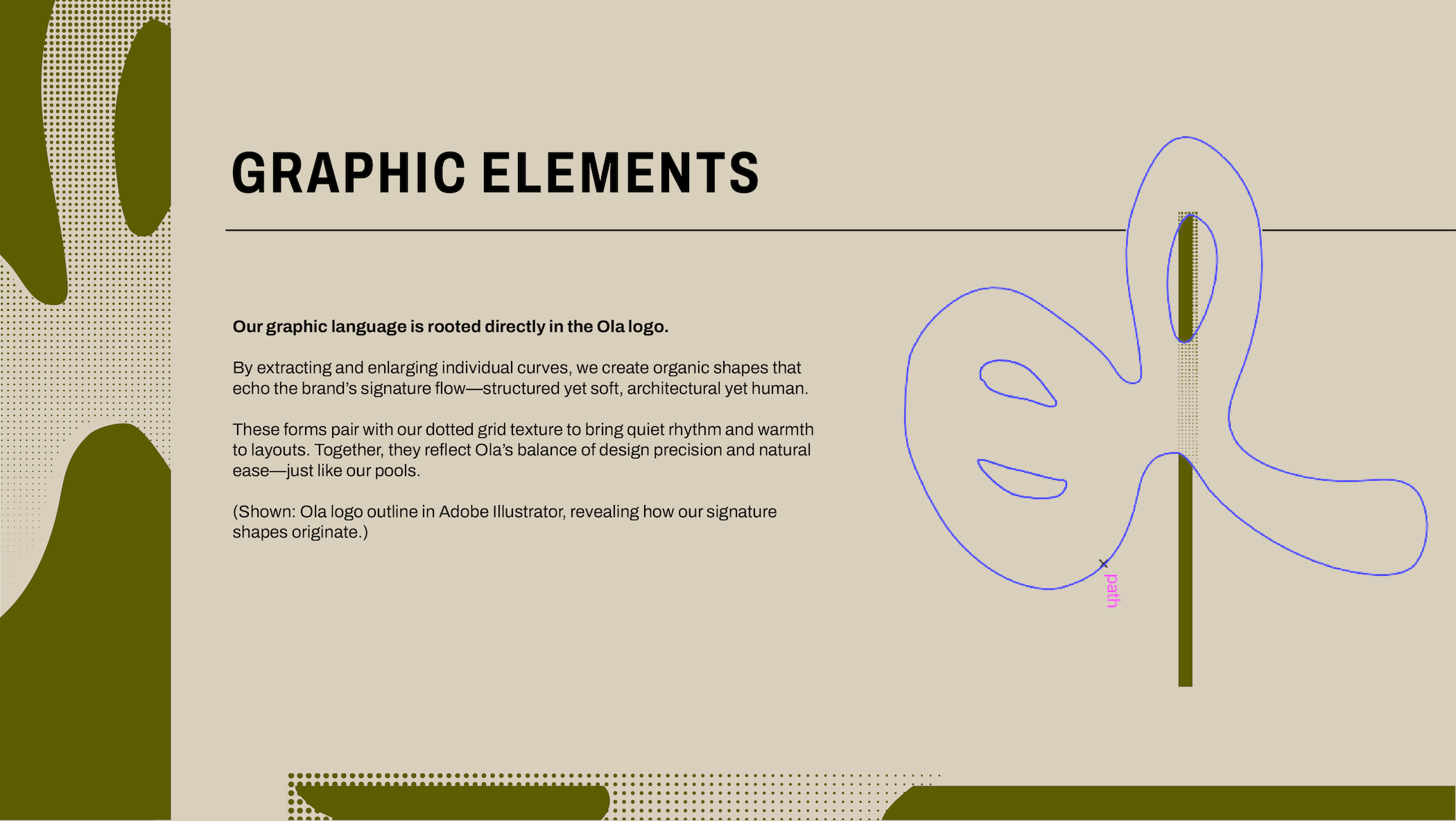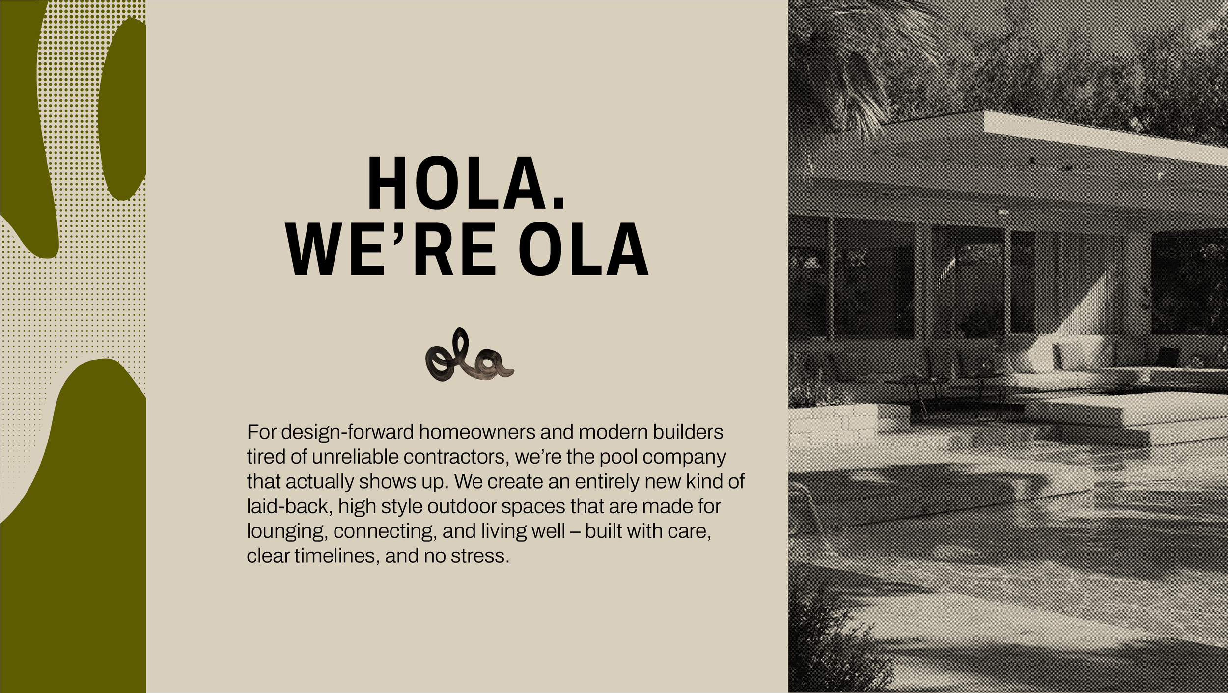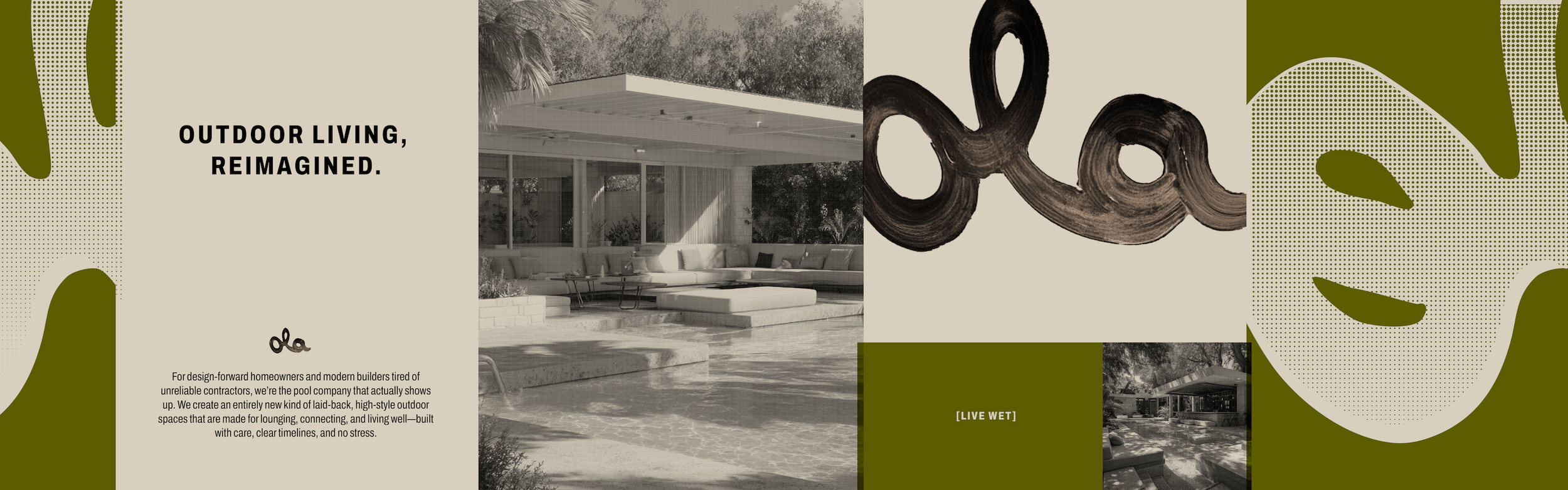 I spearheaded a complete brand identity and visual system for Ola, a luxury pool design and build company. The work included defining a modern coastal aesthetic, creating a modular logo system, establishing the brand’s color palette, typography, and graphic language, and art-directing the photography style. The resulting brand guide captures the calm sophistication and architectural precision that define the Ola experience.